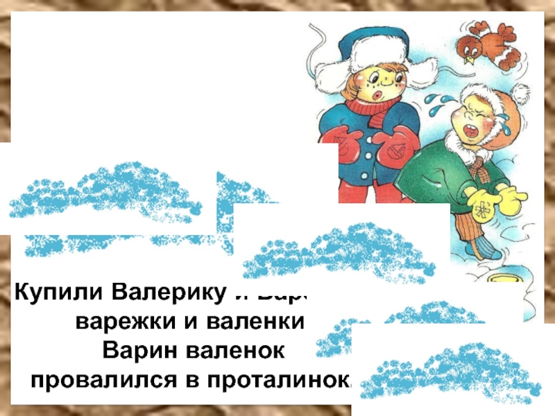 Купили Валерику и Варенькеварежки и валенки.Варин валенокпровалился в проталинок.