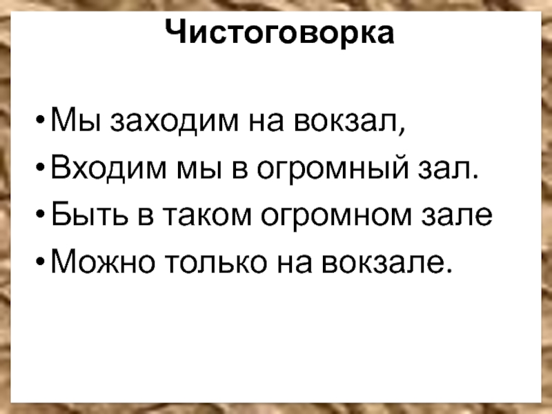 Чистоговорка Мы заходим на вокзал,Входим мы в огромный зал.Быть в таком огромном залеМожно только на вокзале.