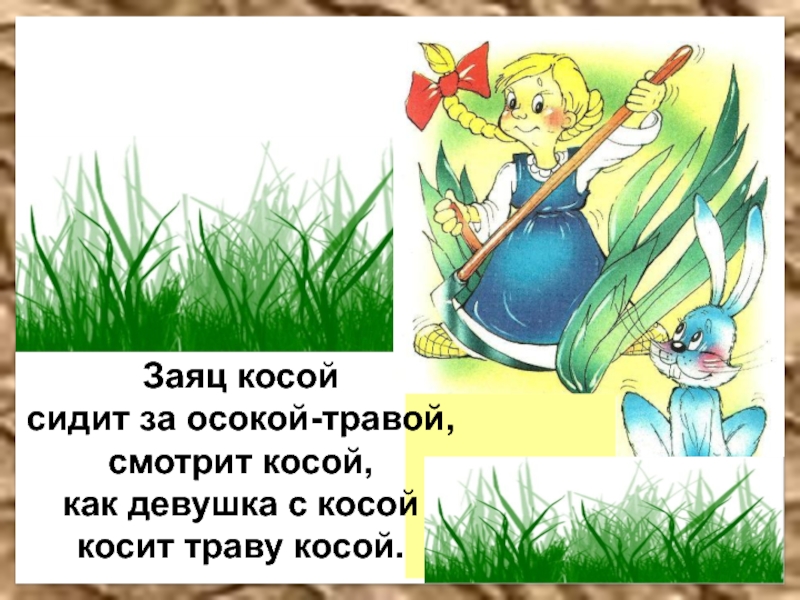 Заяц косойсидит за осокой-травой,смотрит косой,как девушка с косойкосит траву косой.