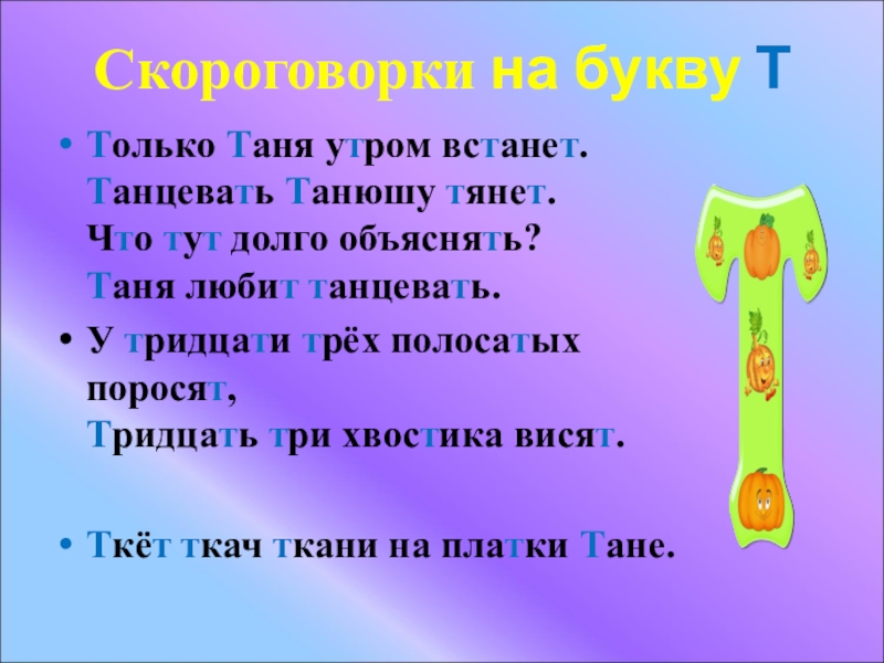 Скороговорки на букву Т Только Таня утром встанет. Танцевать Танюшу тянет. Что тут долго объяснять? Таня