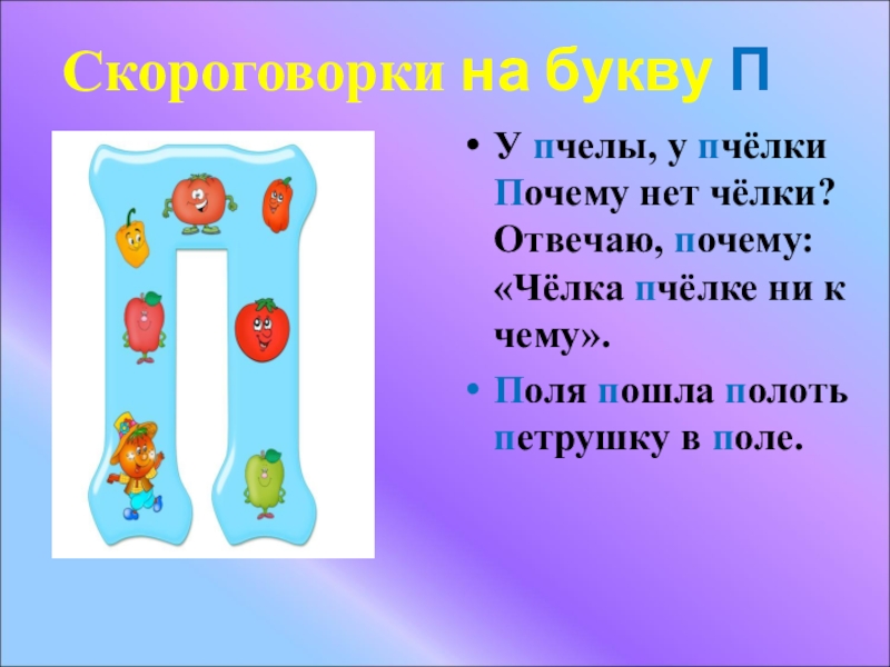 Скороговорки на букву П У пчелы, у пчёлки  Почему нет чёлки?  Отвечаю, почему:  «Чёлка пчёлке ни