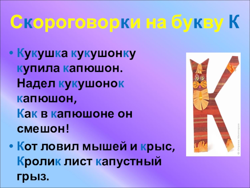 Скороговорки на букву К Кукушка кукушонку купила капюшон. Надел кукушонок капюшон, Как в капюшоне он смешон!Кот