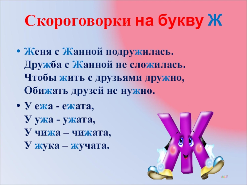 Скороговорки на букву Ж Женя с Жанной подружилась. Дружба с Жанной не сложилась. Чтобы жить с