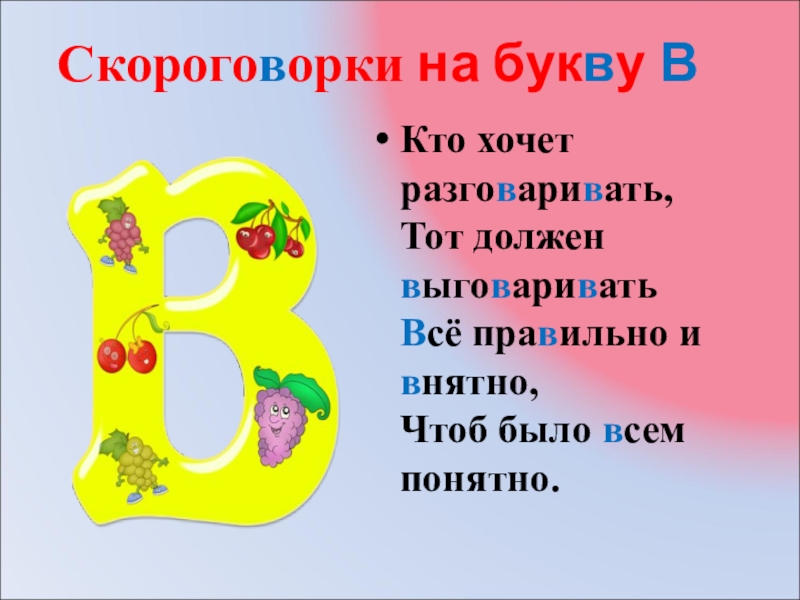 Скороговорки на букву В Кто хочет разговаривать, Тот должен выговаривать Всё правильно и внятно, Чтоб было