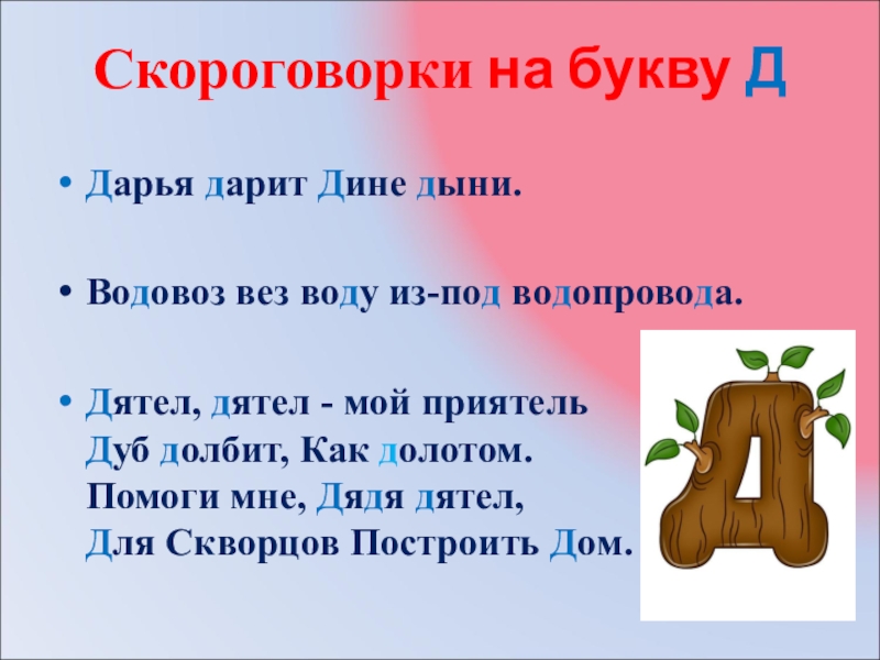 Скороговорки на букву Д   Дарья дарит Дине дыни.Водовоз вез воду из-под водопровода.Дятел, дятел -