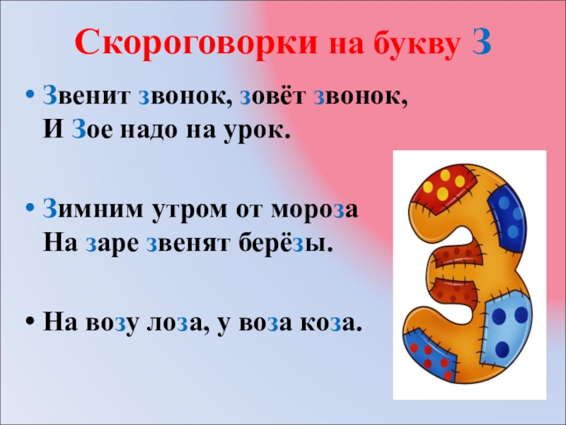 Скороговорки на букву З   Звенит звонок, зовёт звонок, И Зое надо на урок.Зимним утром