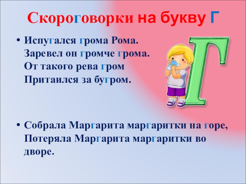 Скороговорки на букву Г Испугался грома Рома.  Заревел он громче грома.  От такого рева гром  Притаился