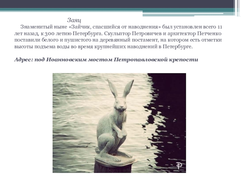Знаменитый ныне «Зайчик, спасшийся от наводнения» был установлен всего 11 лет назад, к 300 летию Петербурга. Скульптор Петровичев и архитектор Петченко поставили белого и пушистого на деревянный постамент, на котором есть отметки высоты подъема воды во время крупнейших наводнений в Петербурге.