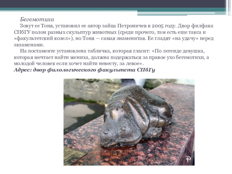 На постаменте установлена табличка, которая гласит: «По легенде девушка, которая мечтает найти жениха, должна подержаться за правое ухо бегемотихи, а молодой человек если хочет найти невесту, за левое».