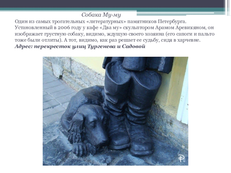 Один из самых трогательных «литературных» памятников Петербурга. Установленный в 2006 году у кафе «Два му» скульптором Арамом Аревикяном, он изображает грустную собаку, видимо, ждущую своего хозяина (его сапоги и пальто тоже были отлиты). А тот, видимо, как раз решает ее судьбу, сидя в харчевне.