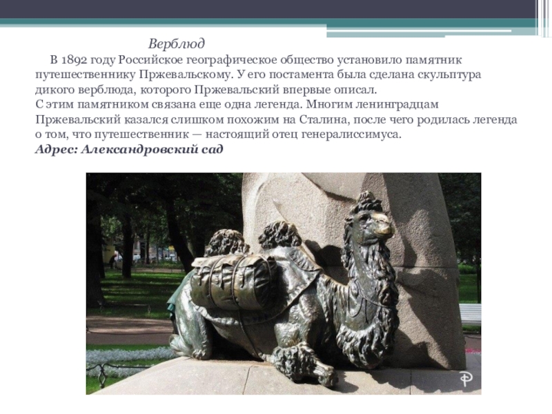 В 1892 году Российское географическое общество установило памятник путешественнику Пржевальскому. У его постамента была сделана скульптура дикого верблюда, которого Пржевальский впервые описал.