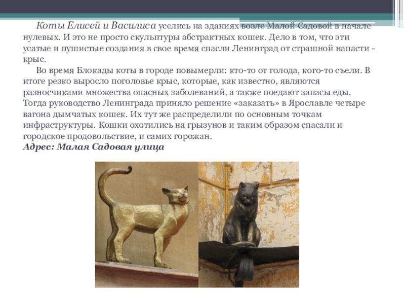 Малой Садовой в начале нулевых. И это не просто скульптуры абстрактных кошек. Дело в том, что эти усатые и пушистые создания в свое время спасли Ленинград от страшной напасти - крыс.
