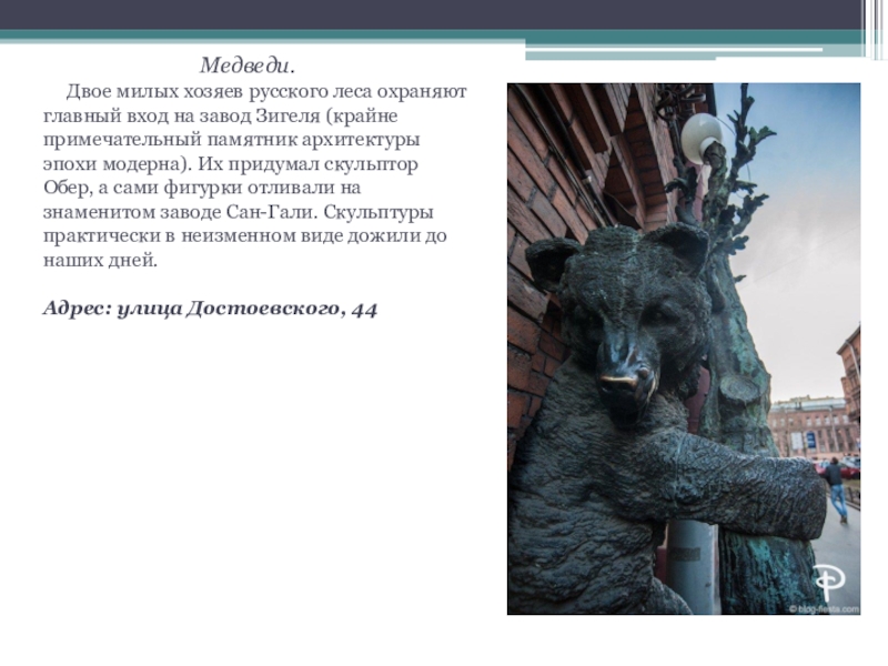 Двое милых хозяев русского леса охраняют главный вход на завод Зигеля (крайне примечательный памятник архитектуры эпохи модерна). Их придумал скульптор Обер, а сами фигурки отливали на знаменитом заводе Сан-Гали. Скульптуры практически в неизменном виде дожили до наших дней.