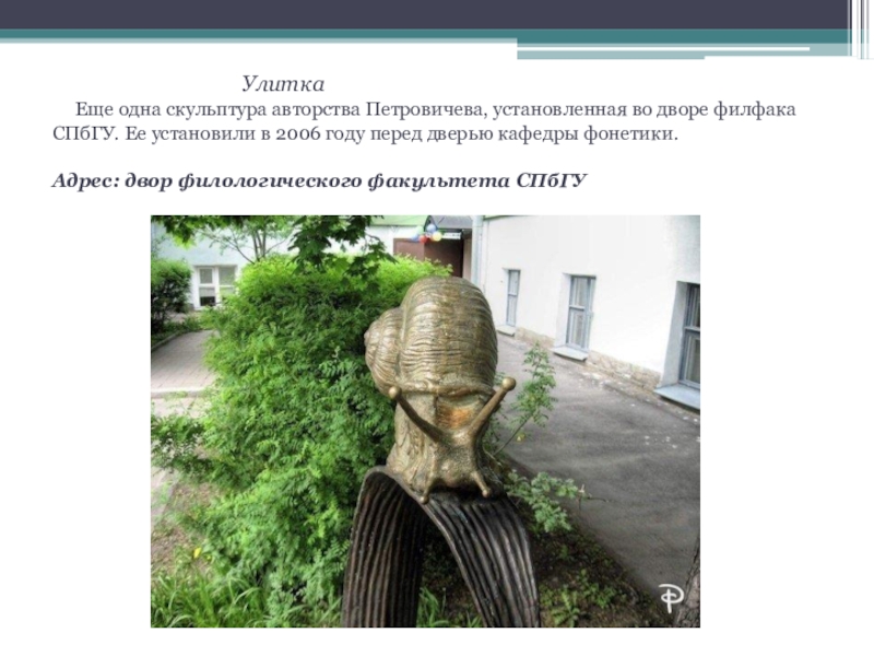 Еще одна скульптура авторства Петровичева, установленная во дворе филфака СПбГУ. Ее установили в 2006 году перед дверью кафедры фонетики.