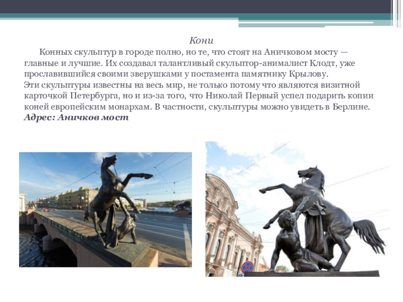 Конных скульптур в городе полно, но те, что стоят на Аничковом мосту — главные и лучшие. Их создавал талантливый скульптор-анималист Клодт, уже прославившийся своими зверушками у постамента памятнику Крылову.