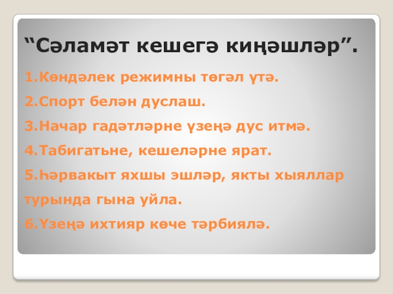 “Сәламәт кешегә киңәшләр”. 1.Көндәлек режимны төгәл үтә. 2.Спорт белән дуслаш. 3.Начар гадәтләрне үзеңә дус итмә. 4.Табигатьне, кешеләрне