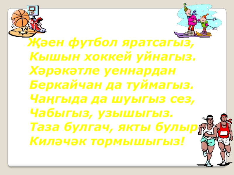 Җәен футбол яратсагыз, Кышын хоккей уйнагыз. Хәрәкәтле уеннардан Беркайчан да туймагыз. Чаңгыда да шуыгыз сез, Чабыгыз,