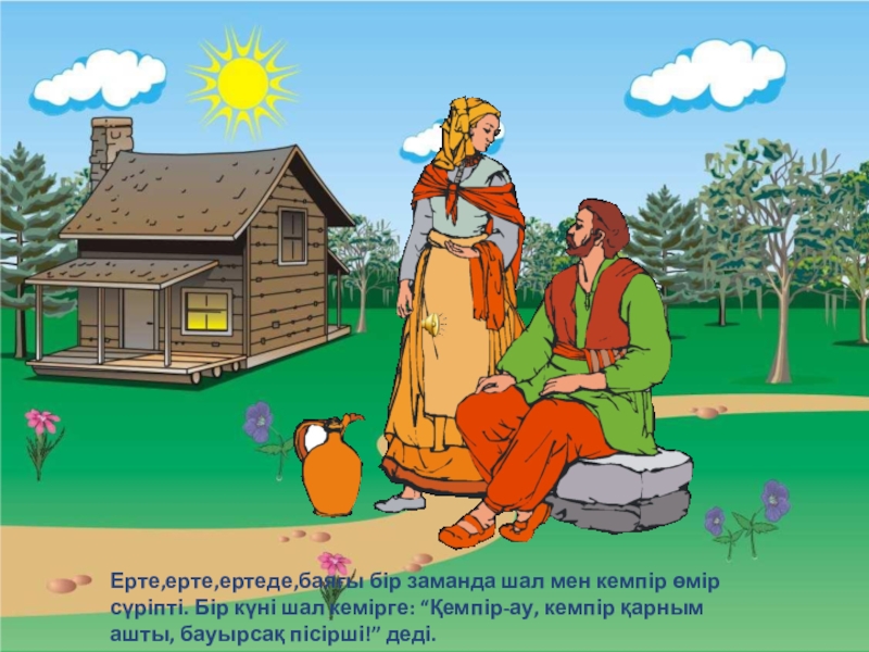 Слайд 2Ерте,ерте,ертеде,баяғы бір заманда шал мен кемпір өмір сүріпті. Бір күні шал