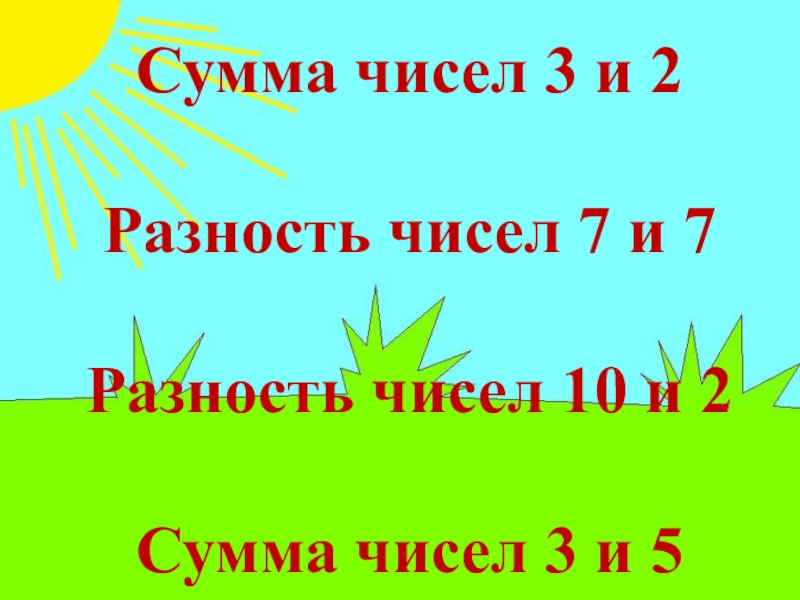 Сумма чисел 3 и 2Разность чисел 7 и 7Разность чисел 10 и 2Сумма чисел 3 и 5