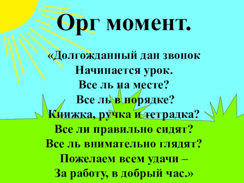 Орг момент. «Долгожданный дан звонок Начинается урок. Все ль на месте? Все ль в
