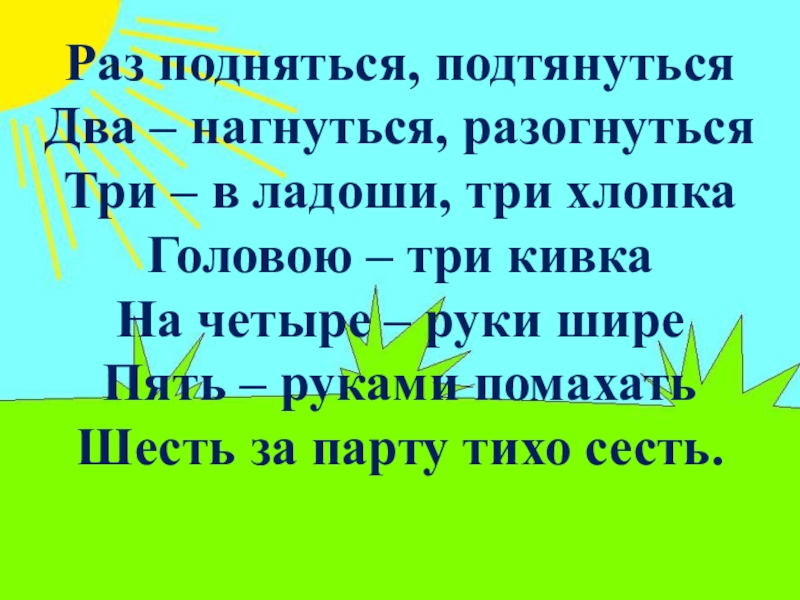 Раз подняться, подтянутьсяДва – нагнуться, разогнутьсяТри – в ладоши, три хлопкаГоловою – три кивкаНа четыре – руки