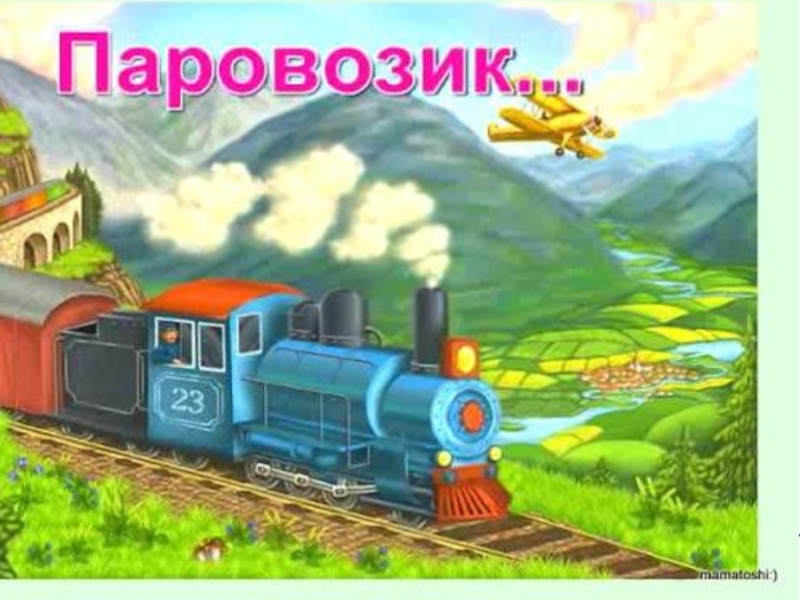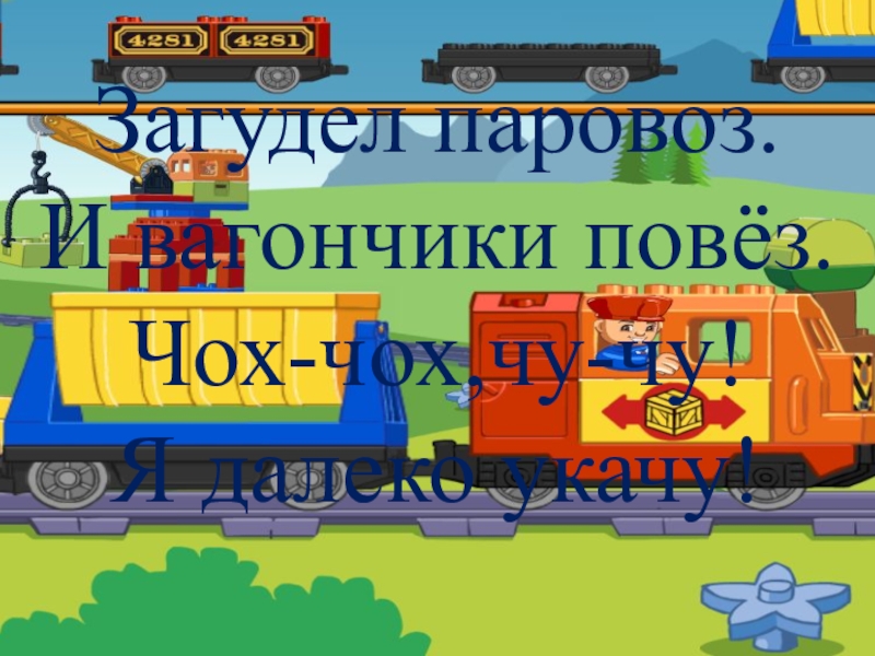 Загудел паровоз.И вагончики повёз.Чох-чох,чу-чу!Я далеко укачу!