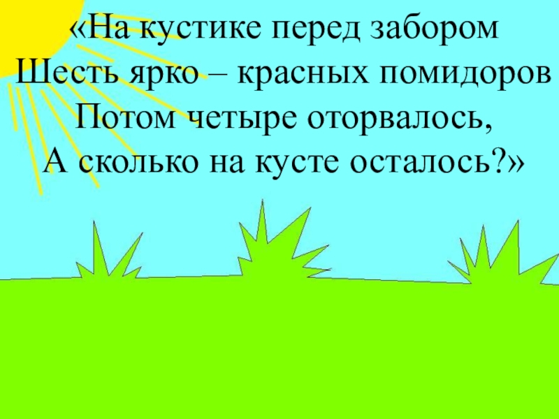 «На кустике перед забором Шесть ярко – красных помидоров Потом четыре оторвалось, А сколько на кусте осталось?»
