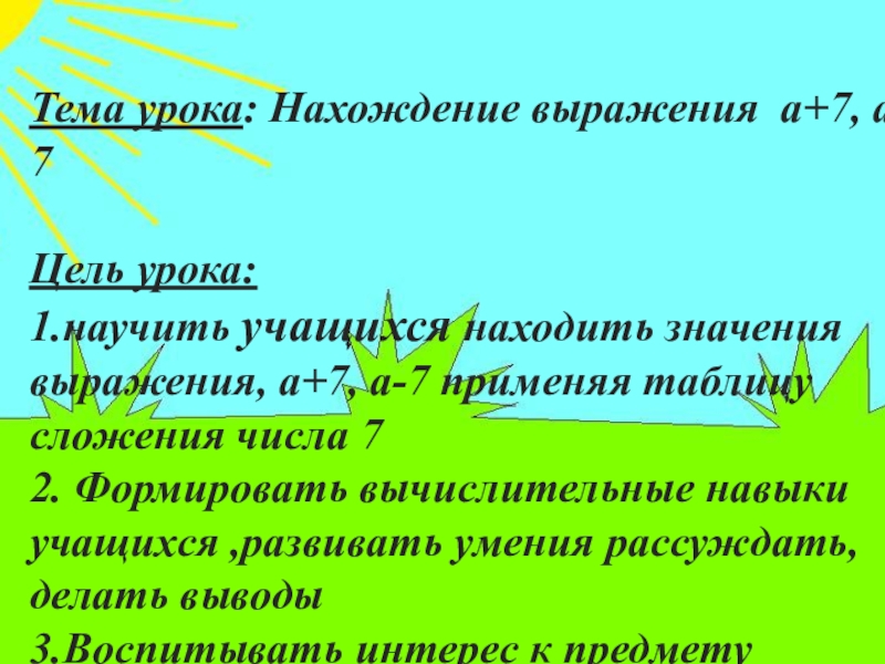 Тема урока: Нахождение выражения а+7, а- 7   Цель урока:  1.научить учащихся находить значения выражения,