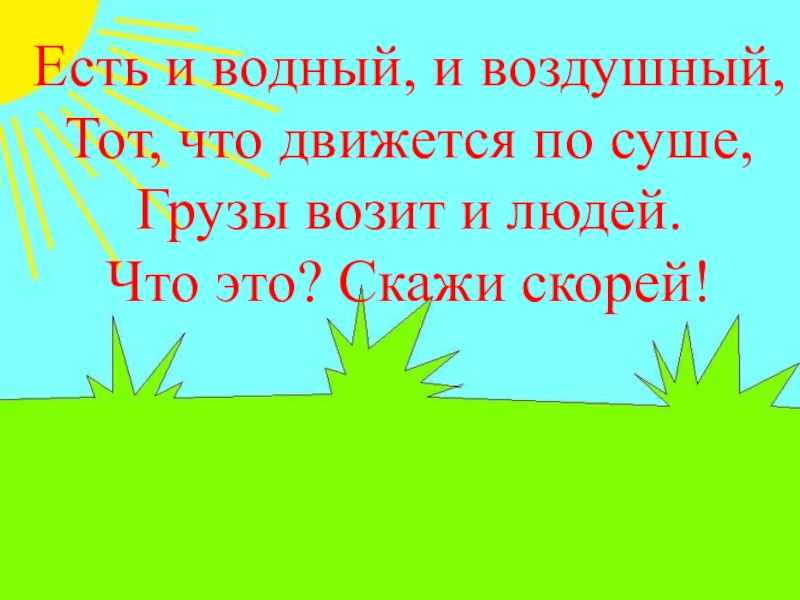Есть и водный, и воздушный,  Тот, что движется по суше,  Грузы возит и людей.  Что это? Скажи