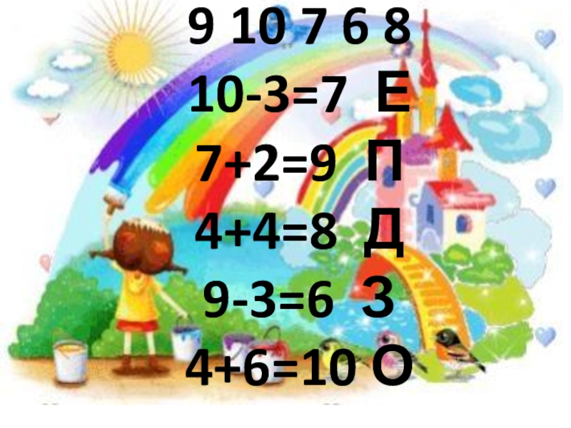 9 10 7 6 8 10-3=7 Е 7+2=9 П 4+4=8 Д 9-3=6 З 4+6=10 О