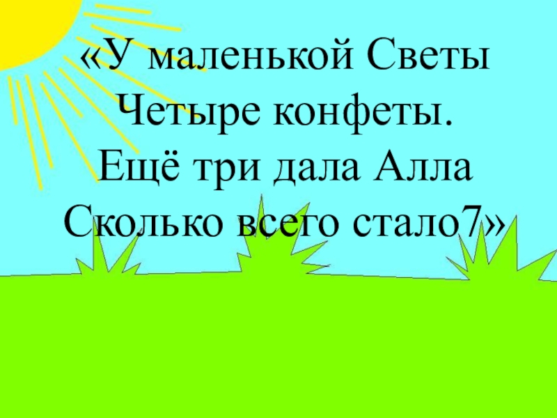 «У маленькой Светы Четыре конфеты. Ещё три дала Алла Сколько всего стало7»