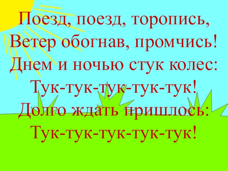 Поезд, поезд, торопись,  Ветер обогнав, промчись!  Днем и ночью стук колес:  Тук-тук-тук-тук-тук!  Долго ждать пришлось:  Тук-тук-тук-тук-тук!