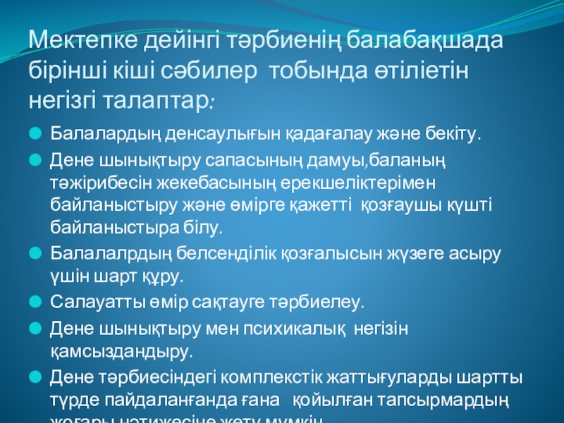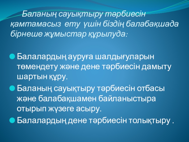 Балалардың ауруға шалдығуларын төмендету және дене тәрбиесін дамыту шартын құру.