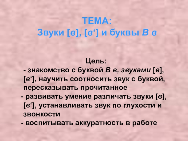 ТЕМА: Звуки [в], [в‘] и буквы В вЦель: - знакомство с буквой В в, звуками [в], [в‘], научить соотносить звук с буквой, пересказывать прочитанное развивать умение различать звуки [в], [в‘], устанавливать звук по глухости и