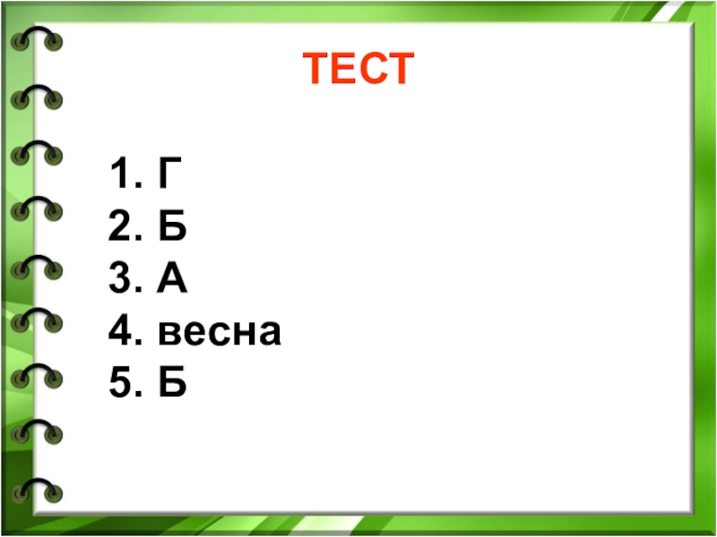 1. Г 2. Б 3. А 4. весна 5. Б