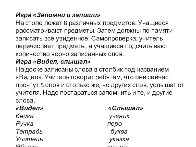 На доске записаны слова в столбик под названием «Видел». Учитель говорит ребятам, что они сейчас прочтут 5 слов и столько же, но других слов, услышат от учителя. Надо постараться запомнить и те, и другие слова.