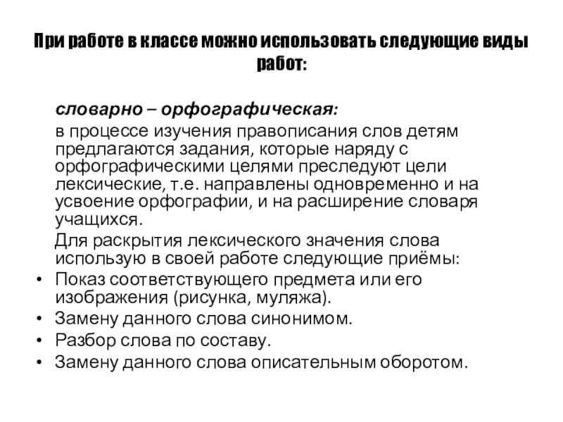 правописания слов детям предлагаются задания, которые наряду с орфографическими целями преследуют цели лексические, т.е. направлены одновременно и на усвоение орфографии, и на расширение словаря учащихся.