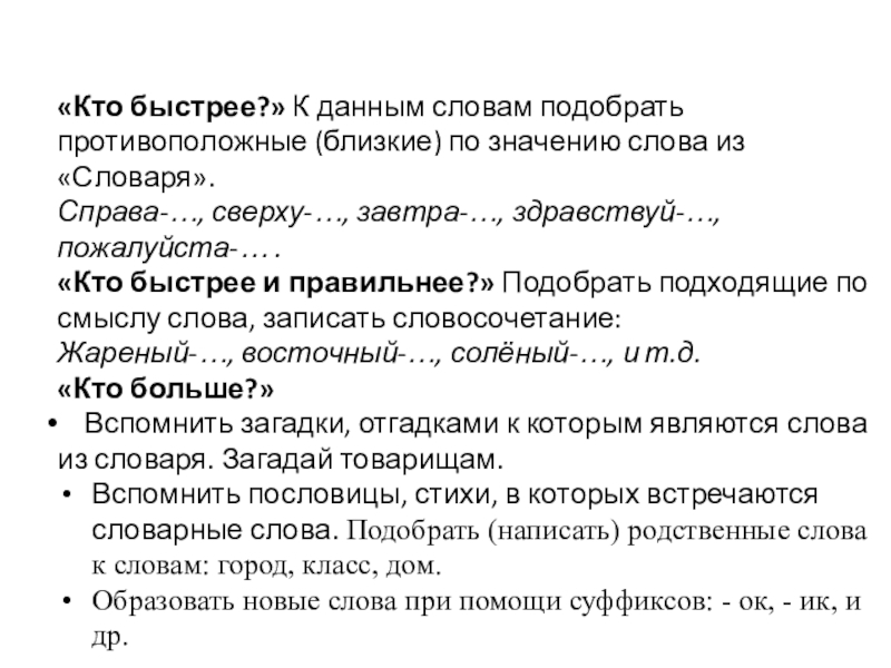 Слайд 11«Кто быстрее?» К данным словам подобрать противоположные (близкие) по значению слова