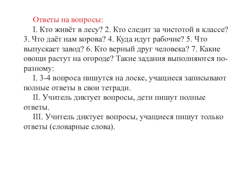 чистотой в классе? 3. Что даёт нам корова? 4. Куда идут рабочие? 5. Что выпускает завод? 6. Кто верный друг человека? 7. Какие овощи растут на огороде? Такие задания выполняются по-разному:
