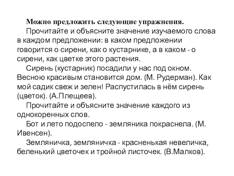 Сирень (кустарник) посадили у нас под окном. Весною красивым становится дом. (М. Рудерман). Как мой садик свеж и зелен! Распустилась в нём сирень (цветок). (А.Плещеев).
