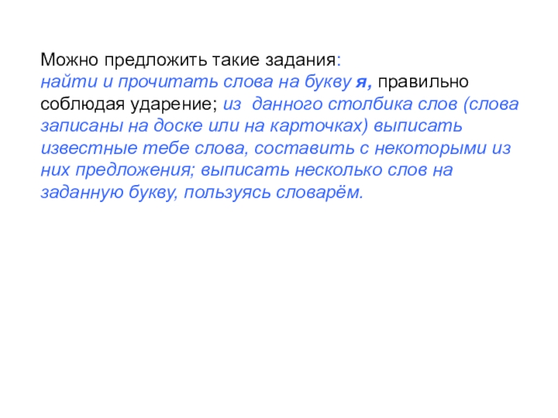 правильно соблюдая ударение; из данного столбика слов (слова записаны на доске или на карточках) выписать известные тебе слова, составить с некоторыми из них предложения; выписать несколько слов на заданную букву, пользуясь словарём.