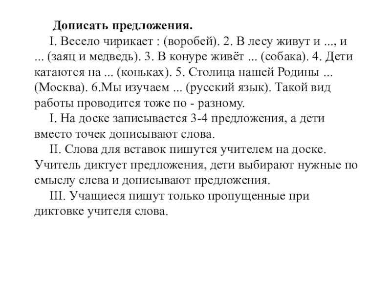 I. На доске записывается 3-4 предложения, а дети вместо точек дописывают слова.