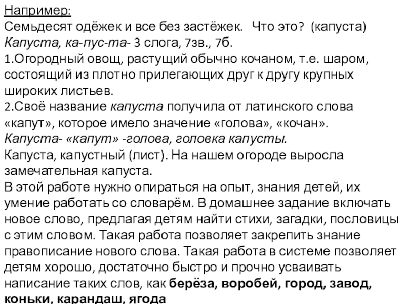 В этой работе нужно опираться на опыт, знания детей, их умение работать со словарём. В домашнее задание включать новое слово, предлагая детям найти стихи, загадки, пословицы с этим словом. Такая работа позволяет закрепить знание правописание нового слова. Такая работа в системе позволяет детям хорошо, достаточно быстро и прочно усваивать написание таких слов, как берёза, воробей, город, завод, коньки, карандаш, ягода