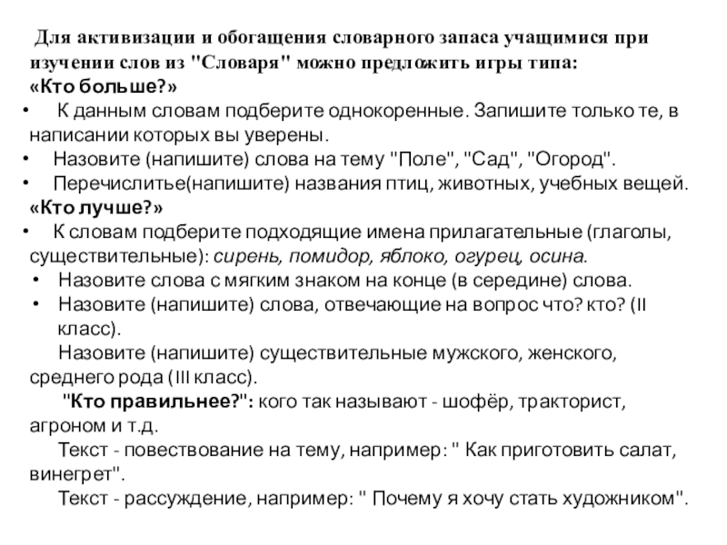 Слайд 10 Для активизации и обогащения словарного запаса учащимися при изучении слов