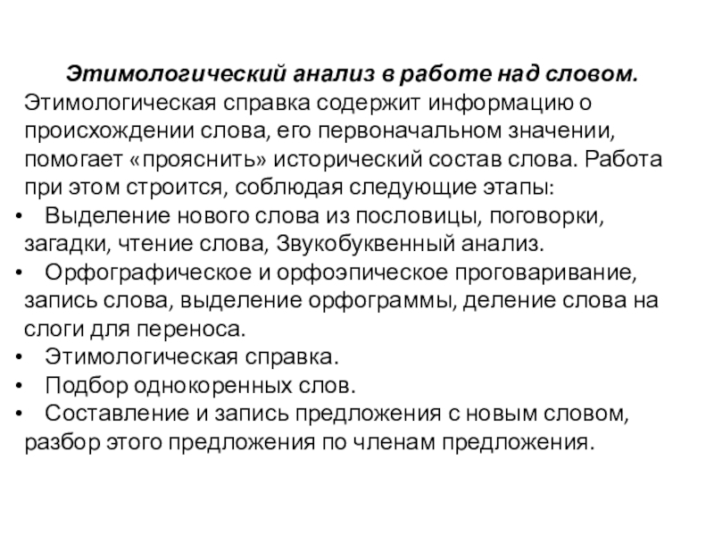 слова, его первоначальном значении, помогает «прояснить» исторический состав слова. Работа при этом строится, соблюдая следующие этапы: