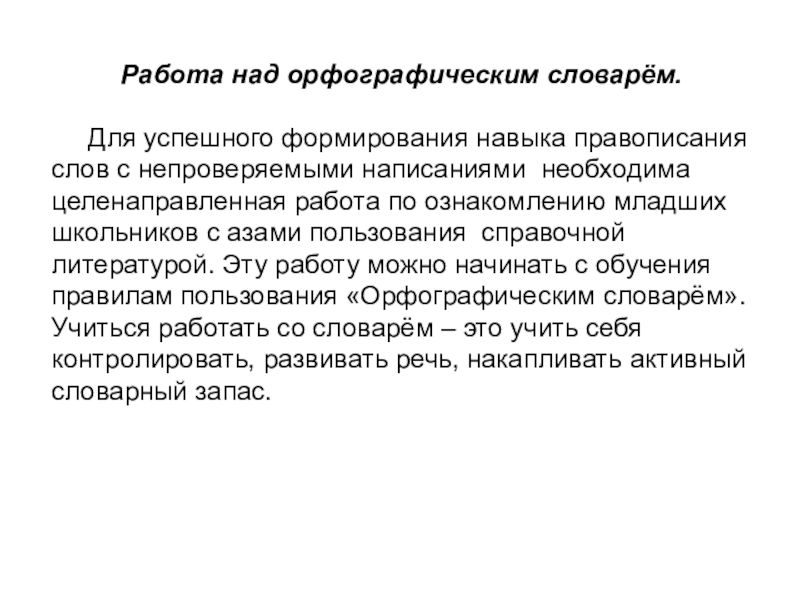 слов с непроверяемыми написаниями необходима целенаправленная работа по ознакомлению младших школьников с азами пользования справочной литературой. Эту работу можно начинать с обучения правилам пользования «Орфографическим словарём».