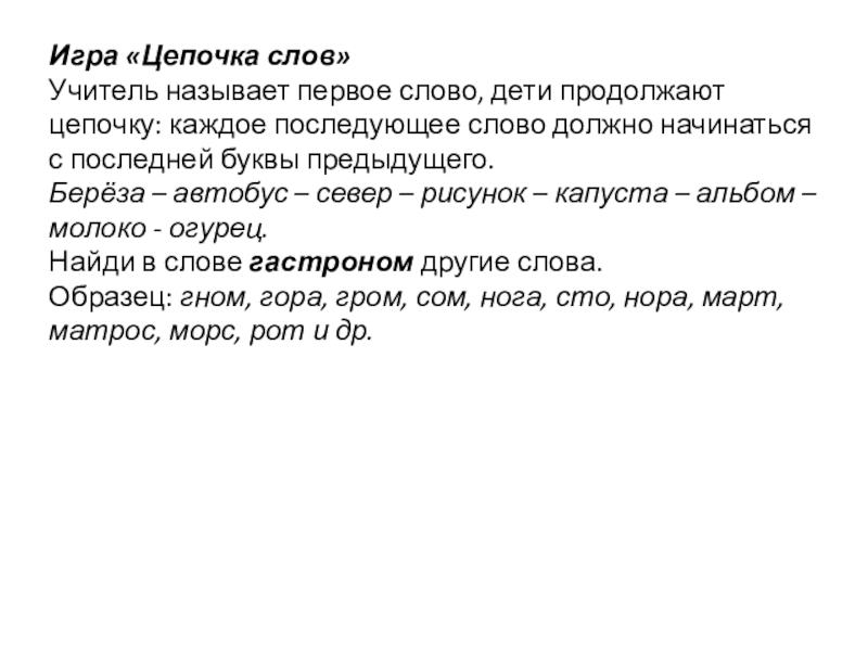 Учитель называет первое слово, дети продолжают цепочку: каждое последующее