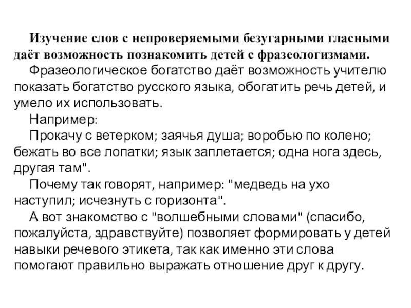 Слайд 9Изучение слов с непроверяемыми безугарными гласными даёт возможность познакомить детей с