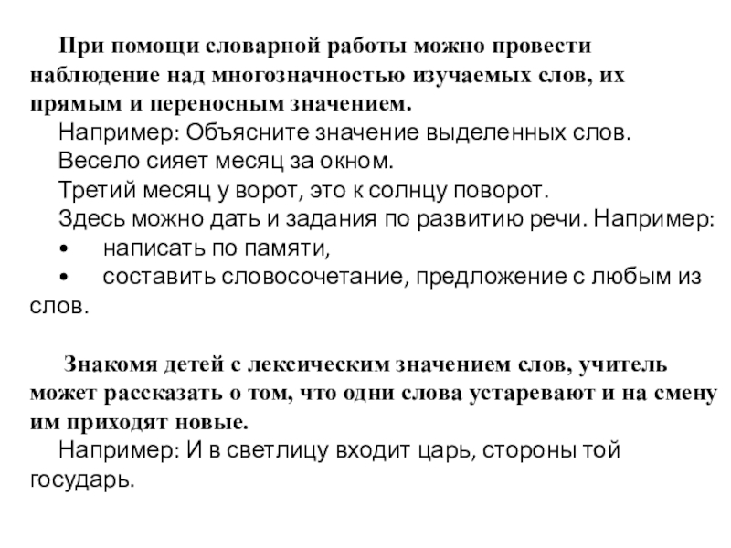 Слайд 8При помощи словарной работы можно провести наблюдение над многозначностью изучаемых слов,