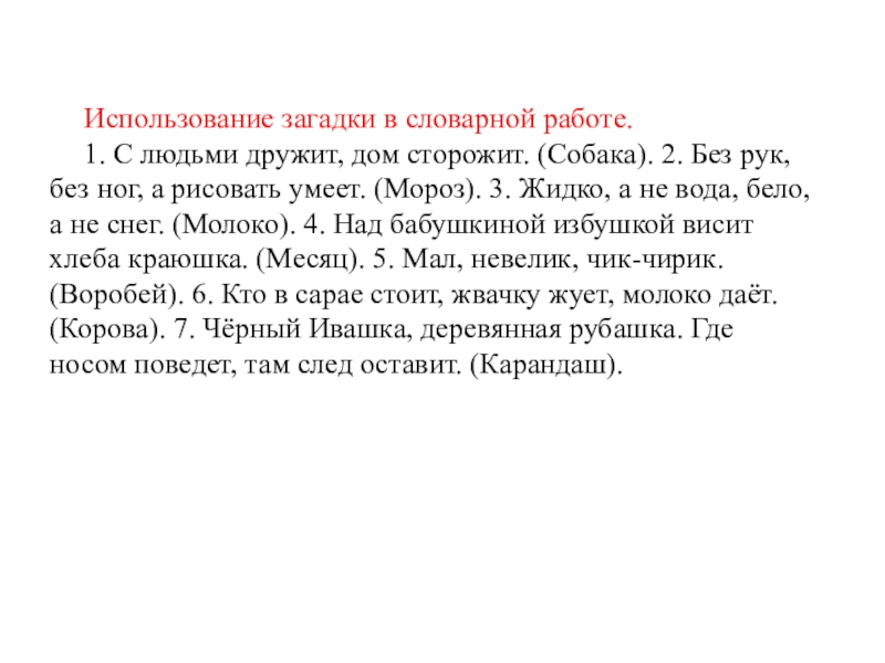 Вспомнить загадки, отгадками к которым являются слова из словаря. Загадай товарищам.
